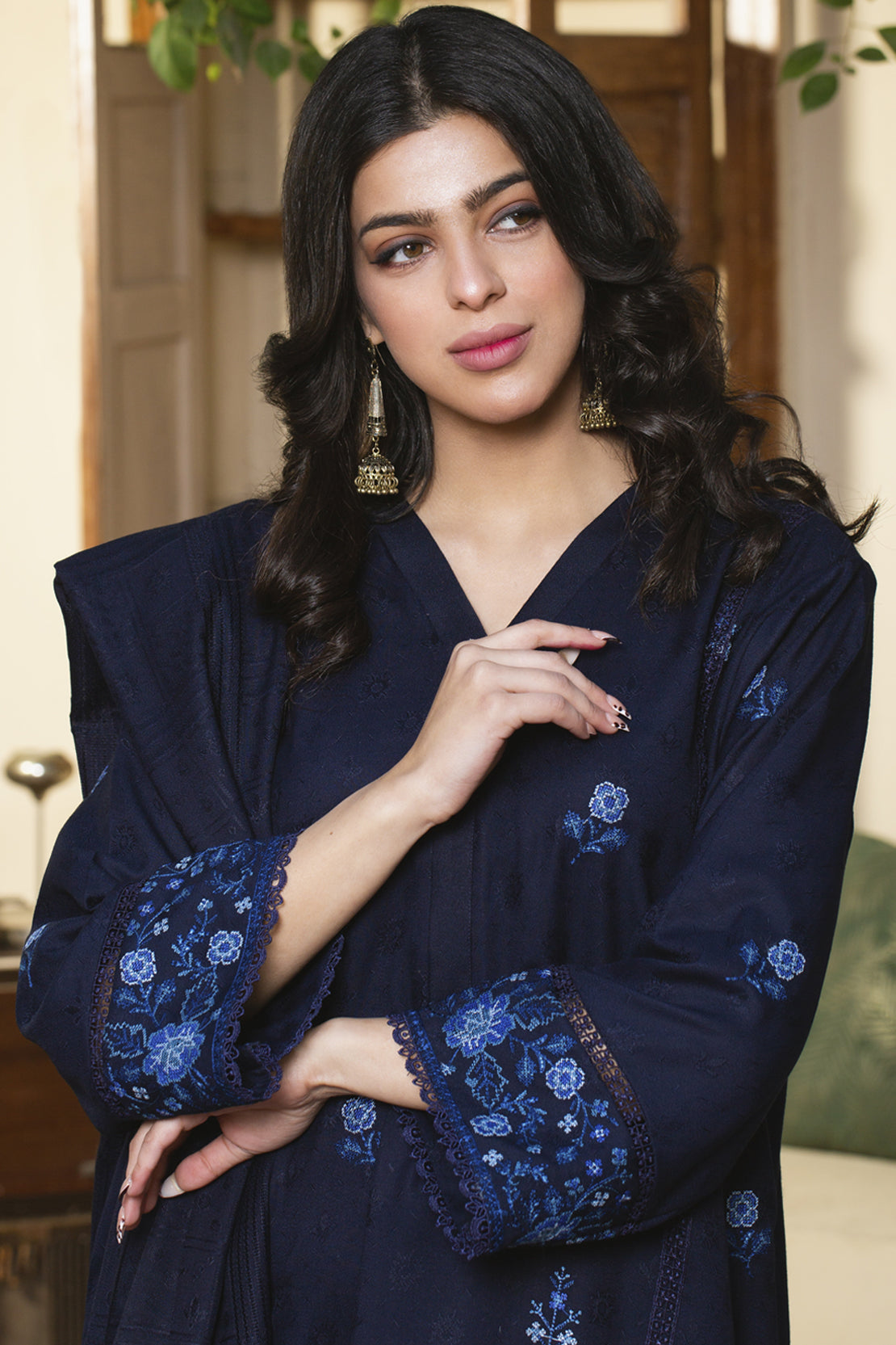 Shirt: Premium Dyed Jacquard Dhanak Wool Shirt with Embroidered Front + Sleeves